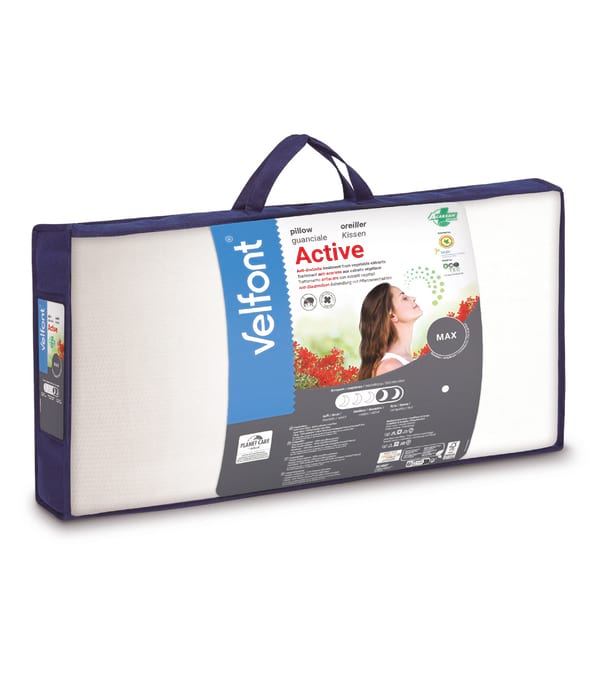 Velfont anti-dulkių erkučių Active pagalvė yra pagaminta iš medvilninio audinio, užpildyto aukštos kokybės pluoštu su Acarsan Natural® apsauga nuo dulkių erkučių su augaliniais ekstraktais, kuri yra moksliškai patikrinta ir išlaiko savo antialergines savybes net ir po plovimo.