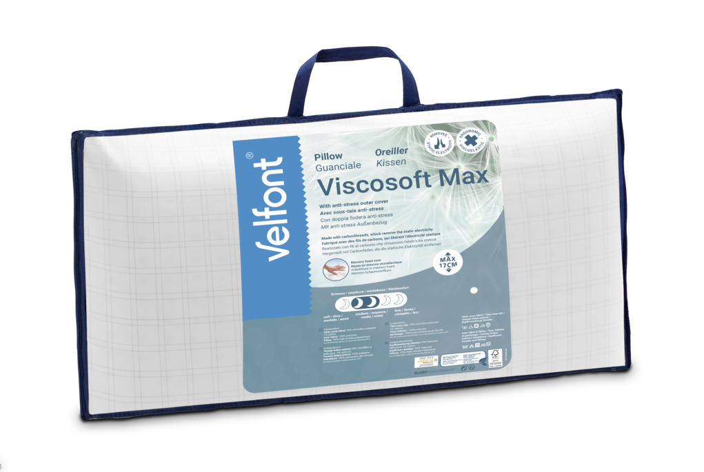 Viscosoft Max pagalvė pagaminta iš specialiai sukurtos 17 cm šerdies, kuri užtikrina  tvirtumą, išsaugant likusias viskoelastines savybes, puikiai prisitaikanti prie galvos ir kaklo formos. Jo dvigubas antistresinis užvalkalas turi anglies siūlus, kurie sugeria ir pašalina mūsų kūne susikaupusią statinę elektrą. Šis dvigubas užvalkalas su užtrauktuku užtikrina visišką pagalvės apsaugą ir  palengvina jos priežiūrą.